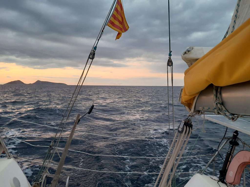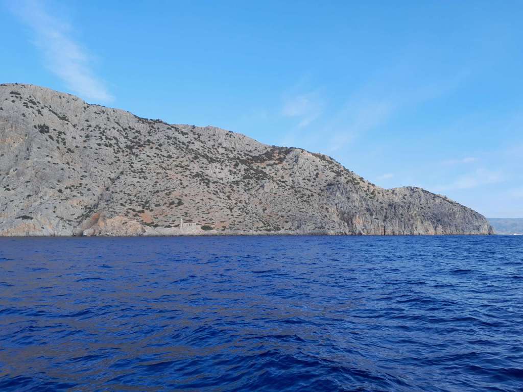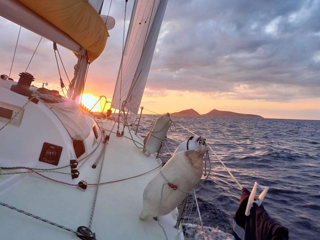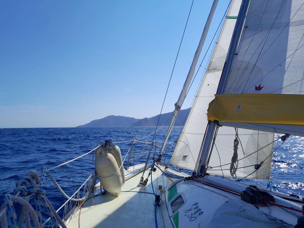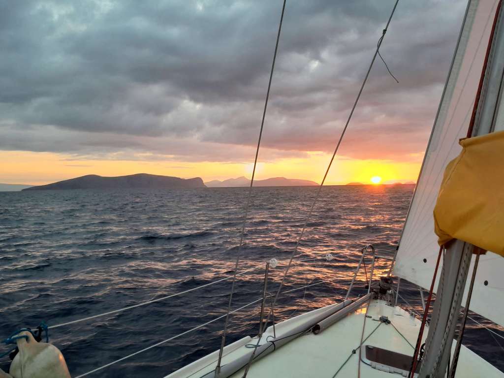 Je suis réveillé par le chant du coq à cinq heures. C’est la nuit, le vent commence à souffler, il fait noir comme dans un four et j’ai un peu le ventre noué. L’ambiance est un peu sinistre, rien à voir avec la veille quand je suis arrivé. Je lève l’ancre, sors de la crique face à l’île de Spetses et envoie les voiles. Rapidement, je fonce toutes voiles dehors comme une balle dans l’obscurité. Des feux rouges sur tribord, un bateau suit la même route que moi, c’est un voilier, plus loin des feux verts me dictent la prudence. C’est ok, il s’agit du ferry qui rejoint l’île. En face des feux blancs à éclats, c’est le petit phare de Kunupia qui indique des hauts fonds et la sortie du canal de Spetses.