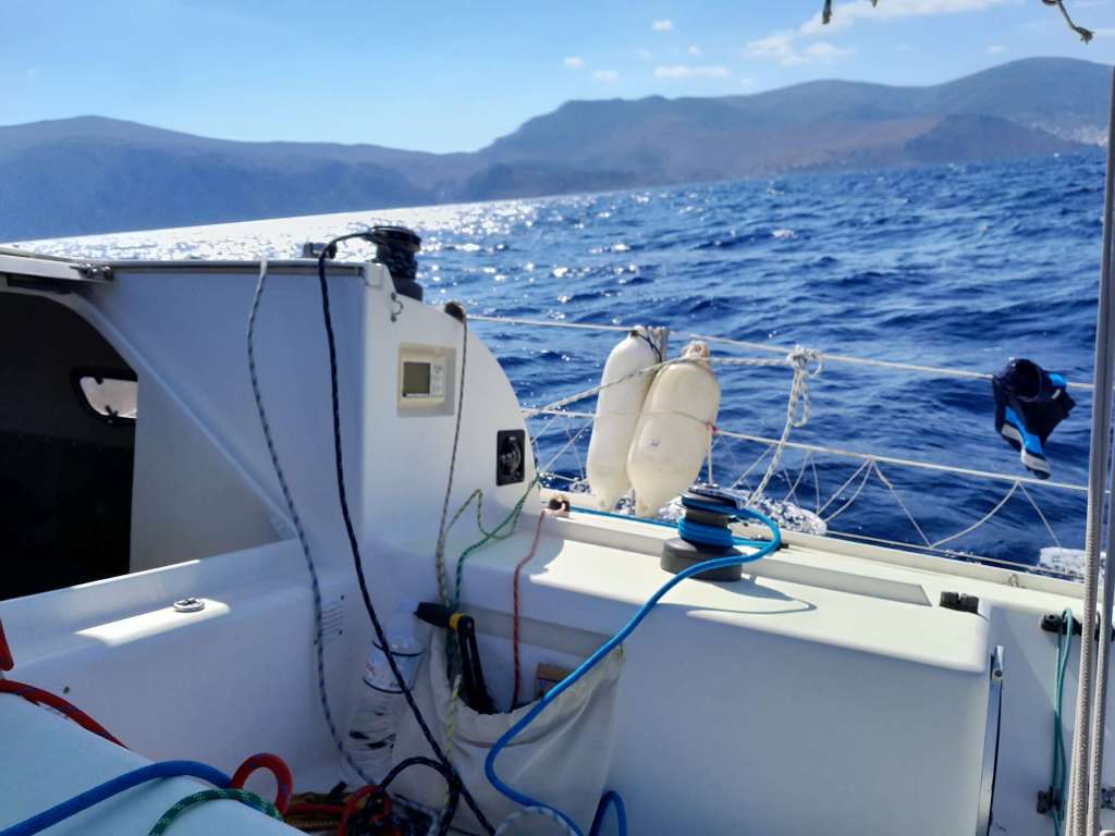 Au bout d’une période d’environ trois heures dans ces conditions, la mer et le vent se calment et je peux renvoyer le génois et faire route directe sur Egine. Et oui, j’ai finalement décidé de remettre le bateau à sec une semaine avant. La météo trop incertaine m’incite à la prudence et puis j’ai hâte de retrouver le gros ventre de ma Dodo !