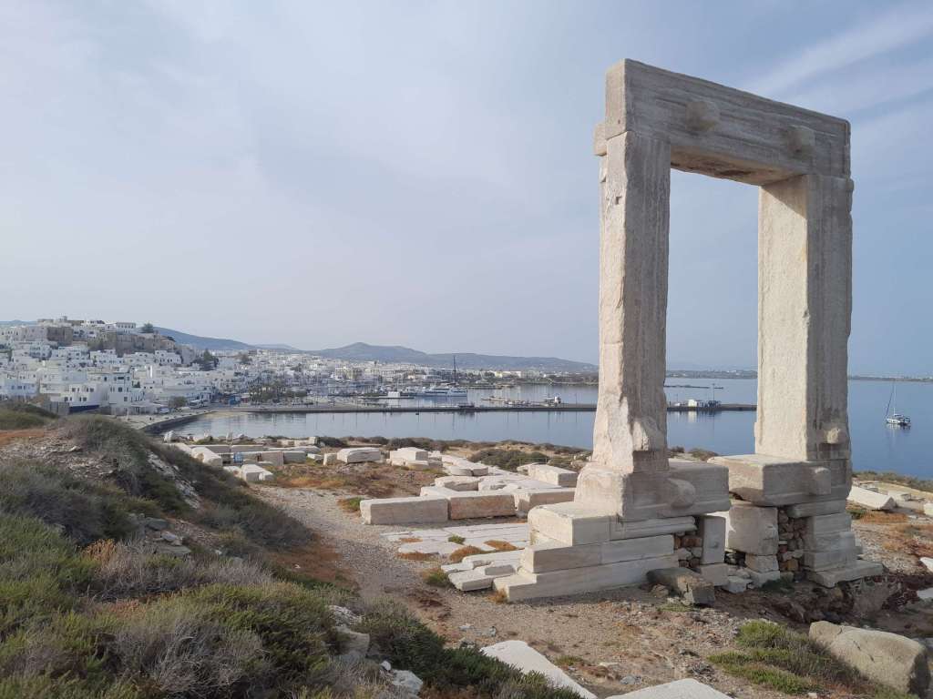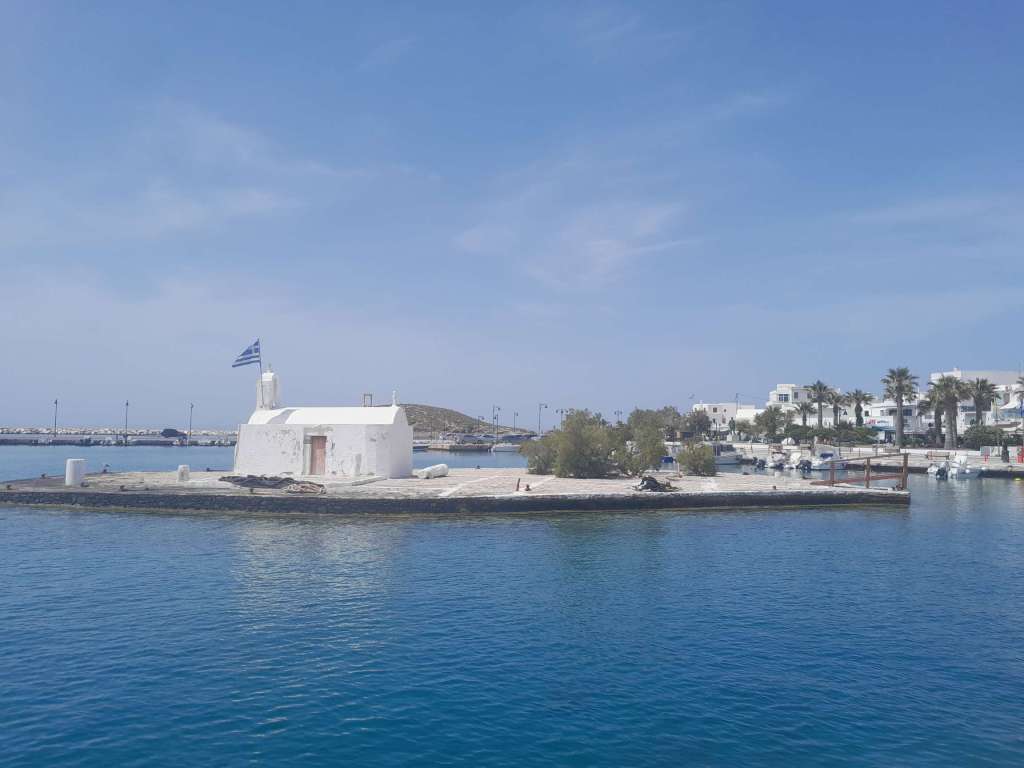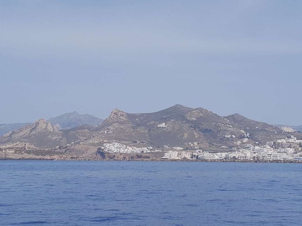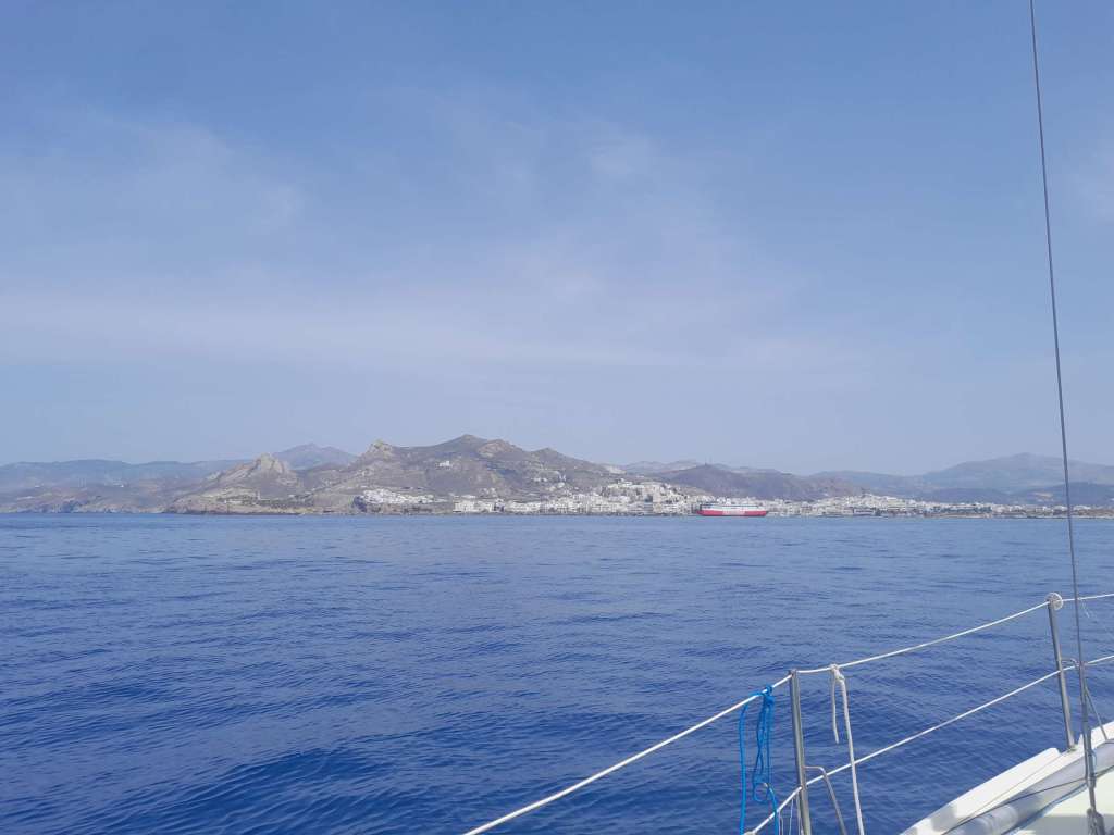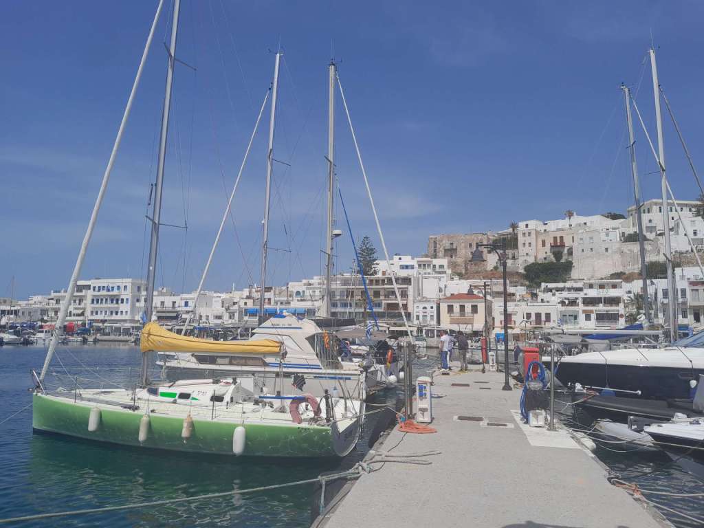 J’arrive doucement dans la baie du petit village de Naoussa. Quel joli nom Naoussa ! J’appelle sur la VHF, personne ne répond. Je décide d’entrer dans le port, plus charmant de l’extérieur que de l’intérieur avec une grosse darse grue au milieu, des travaux, du bruit, des échappements de gasoil. Je me présente néanmoins devant un quai mais les seules places disponibles indiquent « private birth ». Je sais qu’en Grèce cela ne veut pas forcément dire grand chose mais je décide de repartir sans prendre le risque de me faire déloger par 20 nœuds de vent dans le port. En plus, avec les travaux, c’est pas plus mal. Je décide donc de tenter ma chance dans la marina de Naxos distante de huit mille que je me fais au moteur car j’ai la flemme de renvoyer toute la toile.