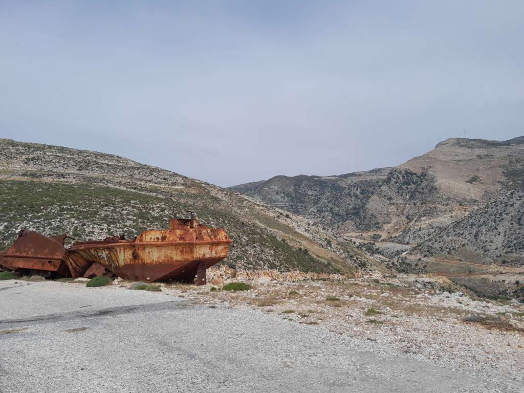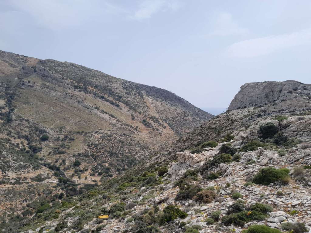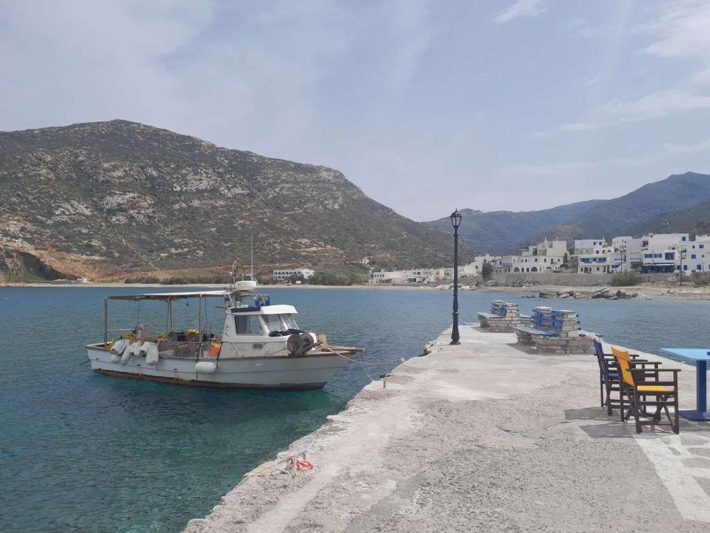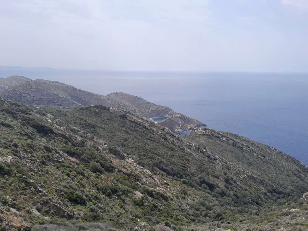 Je continue ensuite ma route pour traverser vers la côte orientale de l’île à travers un paysage rocheux désertique et montagneux uniquement habité d’un grand nombre de chèvres farouches. J’arrive bientôt au hameau de Moutsouna situé au ras de l’eau, lieu d’embarquement désaffecté d’une ancienne carrière. Je me prends un petit rafraîchissement face à la fameuse île d’Armogos, lieu de quête quasi mystique pour moi. Rien que l’apercevoir enfin me crée une émotion. Une légère brume de mer diffuse un halo mystérieux autour de cette île comme des autres tout autour.