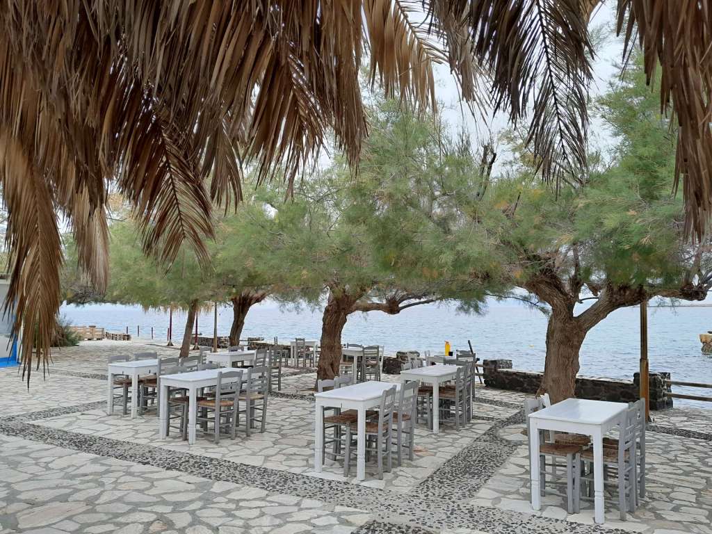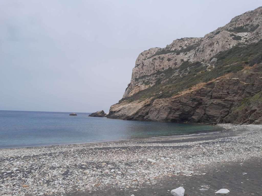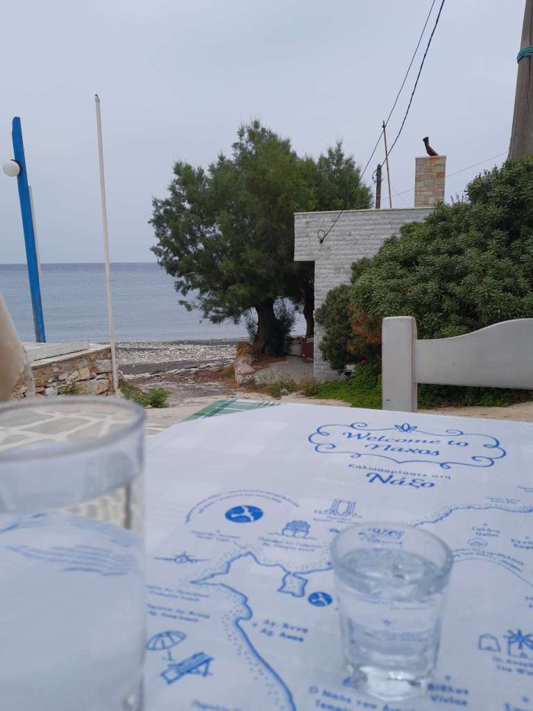 Il est temps de repartir en quête d’un lieu pour déjeuner. Ce sera Paralia Lionas dans une petite baie rocheuse à l’une des deux tavernes locales Ntoyzenia où m’accueille un vieux couple, à priori ravis qu’un rare touriste viennet chez eux. Fromage, olives, sardines grillées au menu, simple, frugal et efficace.