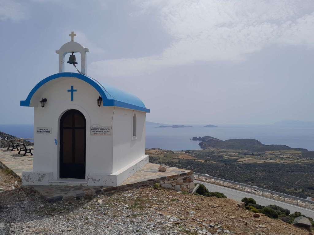 Direction maintenant d’Appolonia au nord est de l’île. La route est toujours aussi belle avec la vue plongeante sur la mer.