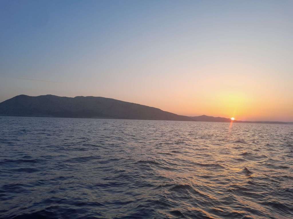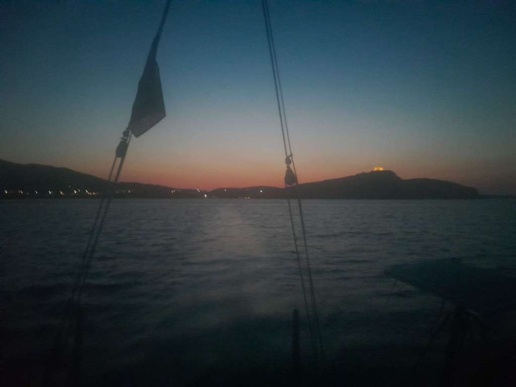 Le réveil fut désagréable dans ce mouillage du cap Sounion à quatre heures du matin par les houles incessantes provoquées par les cargo au large. C’est sympa en début de nuit mais pénible à la longue. Le vent en a profité pour bien se réveiller lui aussi. Je sens que la navigation va être 100% à la voile, une fois de plus. C’est encore la nuit, même si on sent poindre le soleil légèrement. Je lève l’ancre sans difficulté et envoie la grand voile, cap sur Egine. C’est drôle, j’ai un peu l’impression de rentrer à la maison. Mais ce n’est pas ici ma maison, c’est avec mes deux femmes ! L’éloignement commence à se faire sentir et devient pesant. Je suis un peu traversé de nostalgie et de mélancolie renforcées par la puissance des souvenirs d’avec Babar.