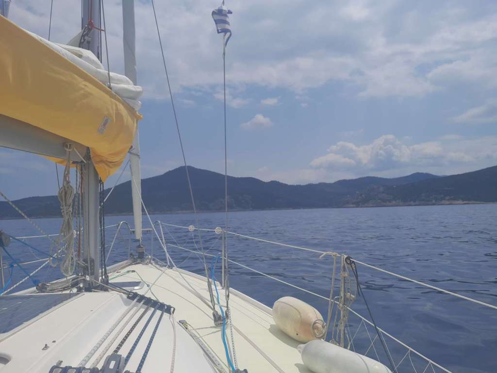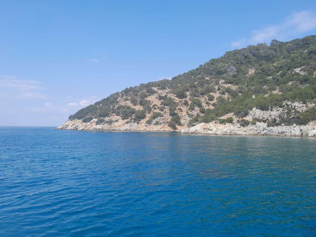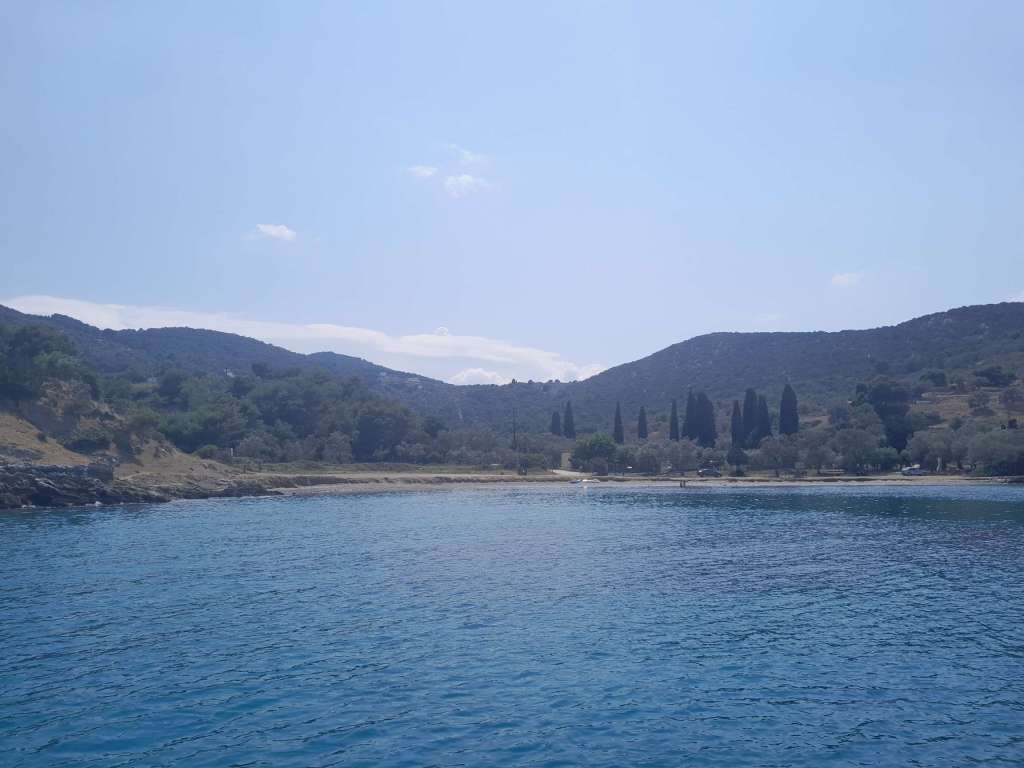 Le vent est faible mais suffisant pour donner des ailes à Babar. L’avantage d’un bateau léger est indiscutable ! Quel plaisir de glisser avec quelques risées et laisser les autres bateaux souvent plus gros scotchés dans la pétole. Quoique je respecte singulièrement ces derniers qui résistent au maximum à la tentation de brancher le moteur, ils sont rares car leur obsession à tous, c’est d’arriver à l’heure à l’apero ! Un peu au hasard, je laisse faire ma curiosité pour aller me trouver une petite place dans une crique située au nord de l’île de Poros, inaccessible par Meltem. Son nom, la calanque Barbari… j’espère qu’elle ne porte pas bien son nom. L’arrivée est grandiose, ce côté ci de l’île, tout comme les autres côtés d’ailleurs à l’exception du sud avec la ville, est sauvage avec des pins à perte de vue et des anfractuosités ressemblant à des petits fjords. Je fais longtemps le tour du propriétaire, enregistre ma trace sur le GPS avec le sondeur actif pour sécuriser ma zone d’évitement. C’est ma méthode lorsque j’arrive dans un mouillage inconnu et assez étroit. Tout semble OK, je mouille l’ancre sur un fond de sable avec quelques roches. Une fois tout en ordre je vais plonger vérifier le mouillage (l’ancre est enfouie) et visiter un peu les fonds alentours. Je passe une belle soirée après m’être mitonné un bon plat de pasta al tonno.