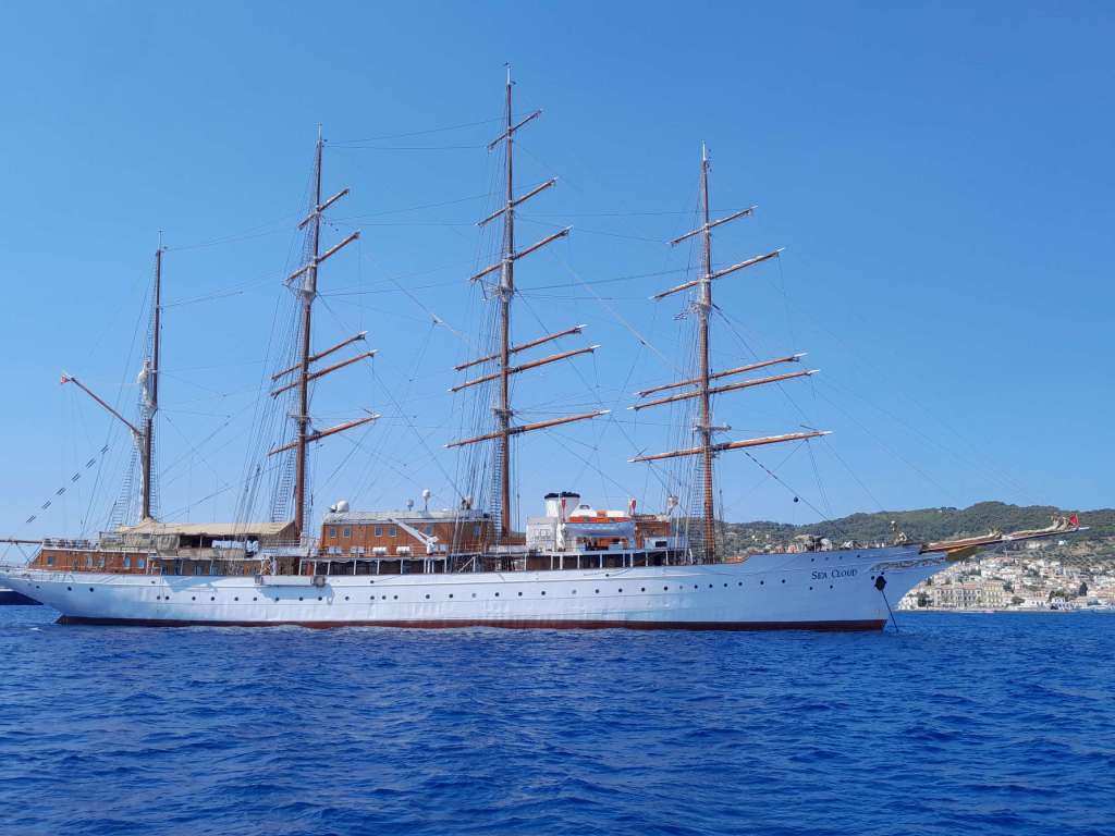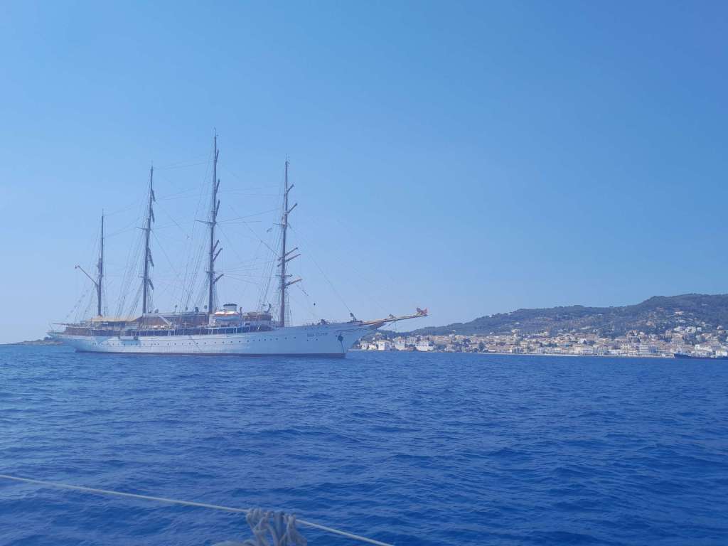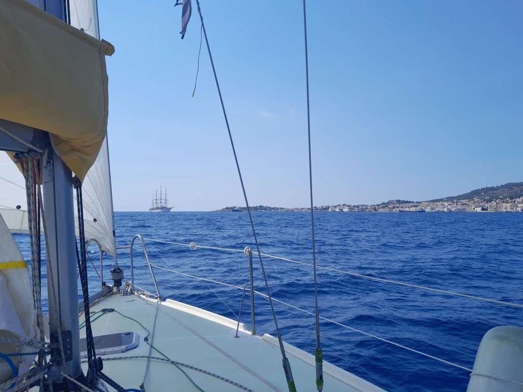 J’arrive rapidement au niveau de l’île de Spetses et croise, au mouillage, un magnifique quatre mâts. Je mets maintenant cap au nord et empanne par babord. En prenant le vent grand largue, celui-ci perd en puissance et ma vitesse de croisière en prend un coup. Mais je reste fidèle à mes engagements nautiques, je ne mets pas le moteur, même si on se traîne un peu.