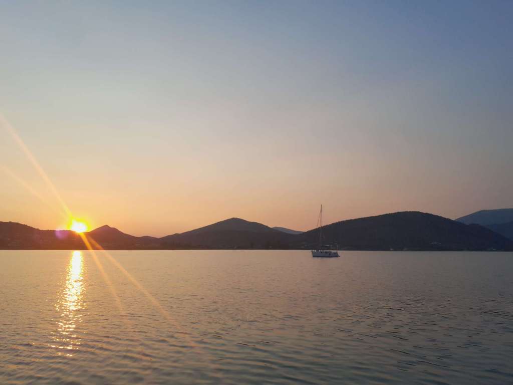 Le mouillage que j’ai choisis convient parfaitement à mon état d’esprit après la dernière mésaventure. Un endroit paisible, non soumis à des vents compliqués et hyper sécurisant au niveau de la qualité de ses fonds. J’adore cette côte de Grèce, on l’appelle la riviera grecque ou la côte d’Azur grecque. Il y a effectivement des similitudes, des villas luxueuses (mais en nombre très restreint comparativement à la côte d’Azur), des forêts de pins, un régime météo doux avec des vents prévisibles et constants et enfin une véritable douceur de vivre. Je souhaite rester ici deux jours. Lorsque l’on reste à un mouillage plusieurs jours, il n’y a pas grand chose à raconter. Je me baigne, je lis, je dors, je glande etc.