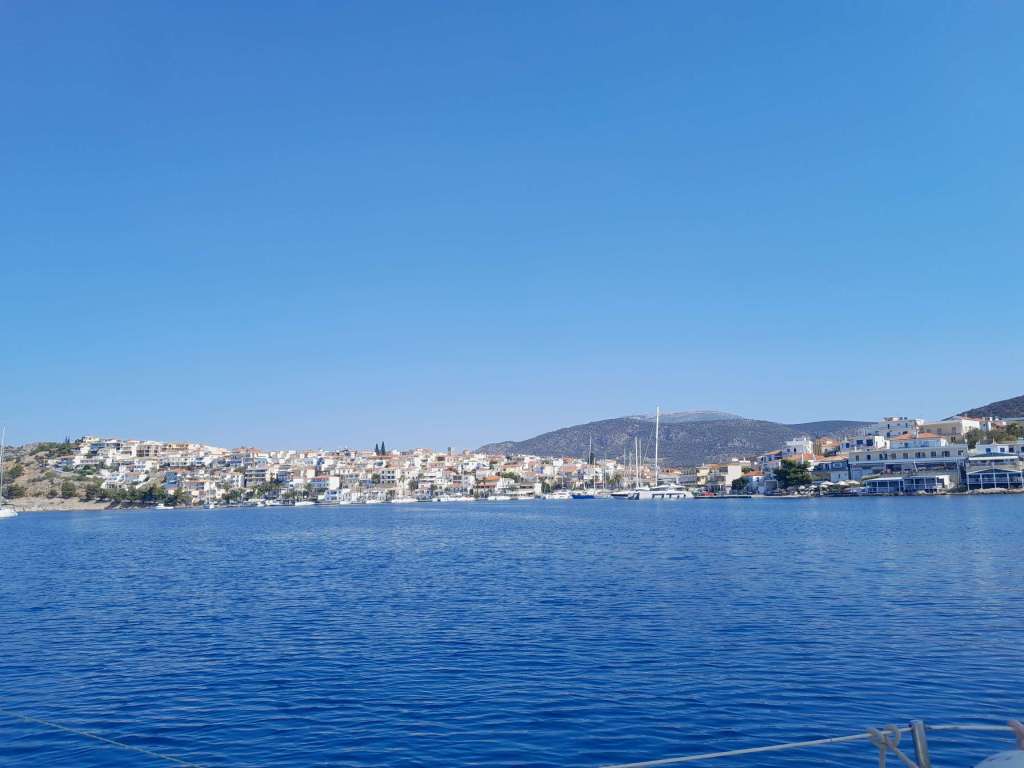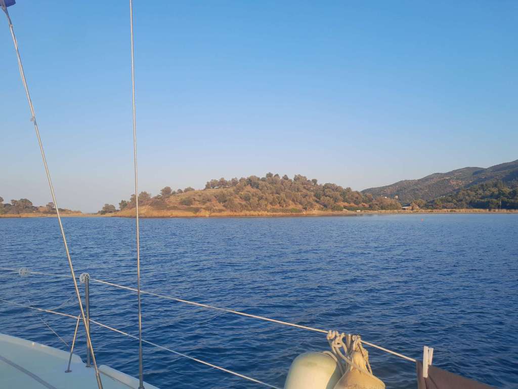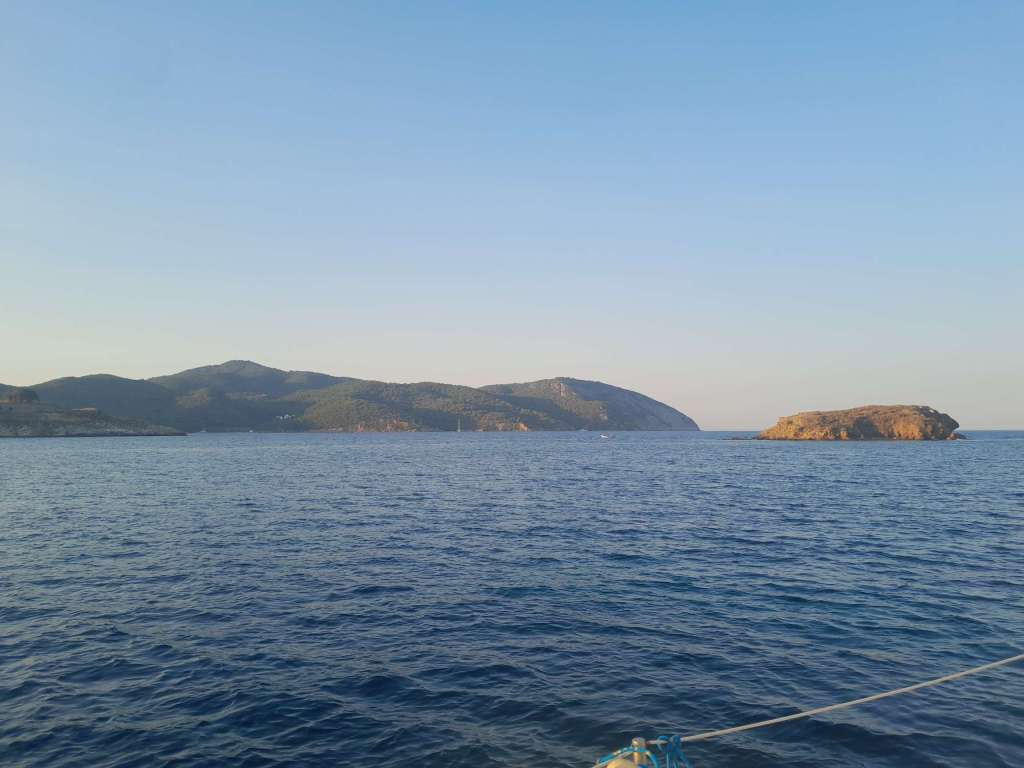 L’objectif du jour, le retour dans le golfe Saronique. Je ne sais pas trop où aller car les possibilités sont nombreuses. Finalement ce sera encore une fois l’île d’Agistri devant Egine. La navigation est fantastique, tout à la voile et avec de nombreuses manœuvres selon les caprices du vent. Initialement je souhaitais mouiller sous le vent de Methania, la grosse presqu’île volcanique située au sud d’Agistri. Mais une fois sur zone j’ai constaté que les fonds étaient trop importants et je ne souhaitais pas reproduire une expérience fâcheuse.