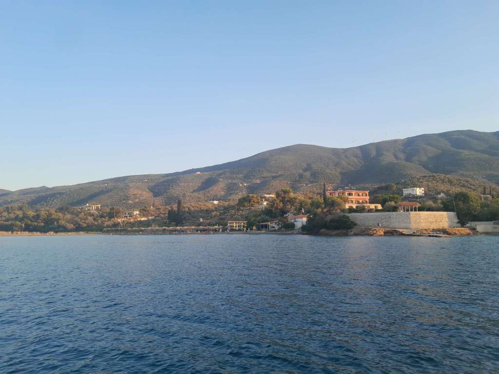 Comme je m’y attendais, entre Hydra et le continent, le vent fraichit considérablement et vient toujours du nord, même s’il est prévu du sud ! C’est à devenir fou. Je ne compte plus les virements de bord sous quinze nœuds. Passé la pointe entre Poros et Hydra, le vent tourne et passe sur mon tribord grand largue. Je choisis d’aller mouiller dans une petite anse protégée du vent d’est à sud est, situé à l’entrée du golfe de Poros. Son nom Aliki. Je suis, une fois de plus, tout seul entouré de montagnes verdoyantes. L’endroit est fort joli et à l’abri. Je passe une soirée d’une grande douceur même si la chaleur d’une canicule à venir commence à se faire sentir.
