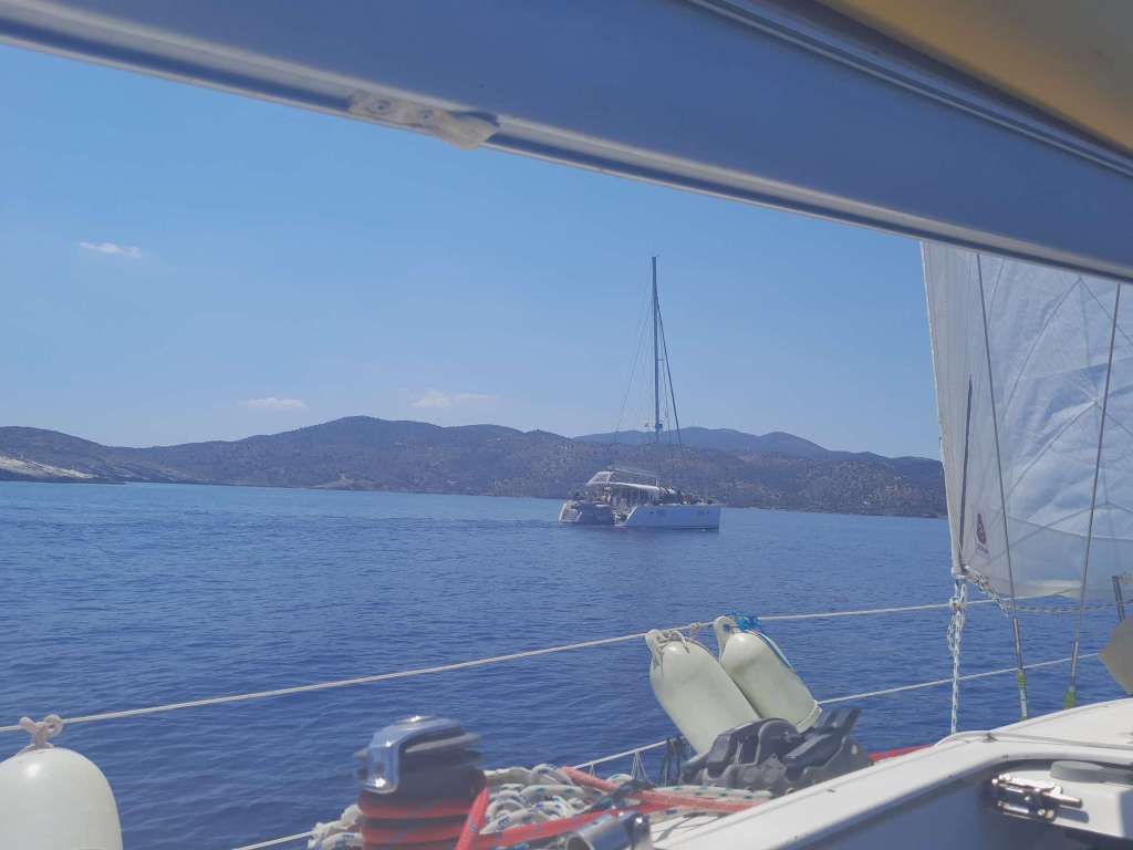 Je suis réveillé à six heures par une belle houle. Celle-ci vient du nord ouest, signe qu’il doit y avoir du vent fort dans les parages du canal de Corinthe. Il fait déjà chaud. Après le petit déjeuner, je lève aussitôt l’ancre pour profiter d’un vent qui monte et aller à mon dernier mouillage des vacances au nord de l’île d’Egine, avant la remise à sec de Babar prévue samedi à neuf heures de matin. Le vent vient sur l’arrière du bateau mais hélas, il s’éteint doucement passe l’île Moni au sud d’Egine. Il est environ dix heures et la canicule fait lentement mais sûrement son office. Je ne veux pas brancher le moteur par peur qu’il crée encore plus de chaleur à l’intérieur. J’opte pour le calvaire de la pétole et de supporter d’avancer à un nœud voire même être totalement stoppé. Entre deux maux, je choisis le moindre, comme dirait le capitaine Aubrey ! Ce régime pénible va durer des heures. La chaleur devient terrible et tutoie les quarante degrés. Je suis en quête permanente d’ombre, en me déplaçant sur le bateau pour être protégé de la grand voile à grès de l’orientation du vent.