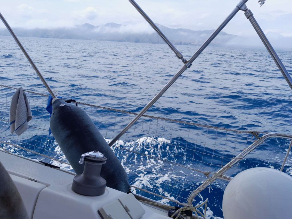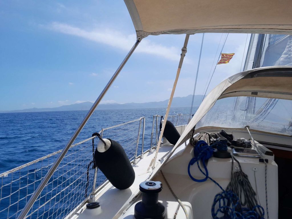 J’envoie les voiles, éteins le moteur pour profiter d’un faible vent d’est qui doit nous porter vers le sud. Le Canigó veille sur nous et nous porte chance car les conditions sont clémentes pour cette première.