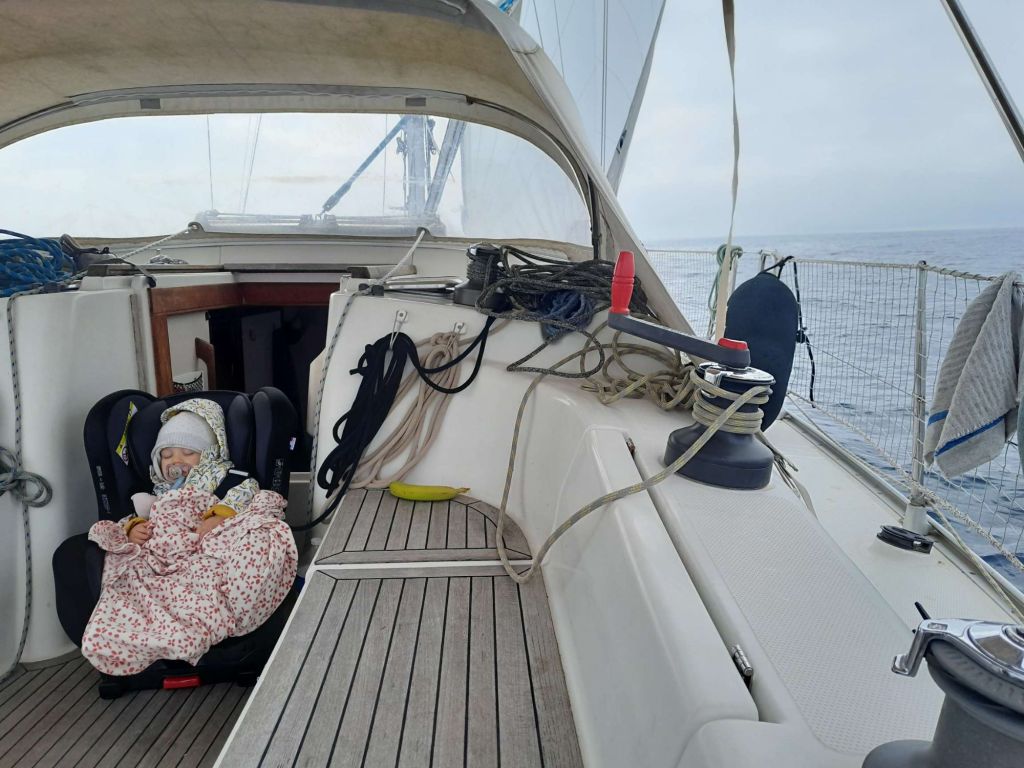 Xavier, mon voisin du magasin AD Nautic, m’aide gentillement pour larguer les amarres. Ça y est, nous voici à emprunter le long canal qui nous mène vers le large. Raphaëlle, du haut de ses bientôt seize mois, ne se rend pas vraiment compte de ce qu’il se passe, mais pour nous deux, Doriane et moi, le moment est important et un peu solennel. La dernière fois où l’on partait c’était à bord de Babar 1. Qui aurait cru que nous allions un jour découvrir la joie d’être parents d’une si jolie petite fille à bord d’un autre bateau ?