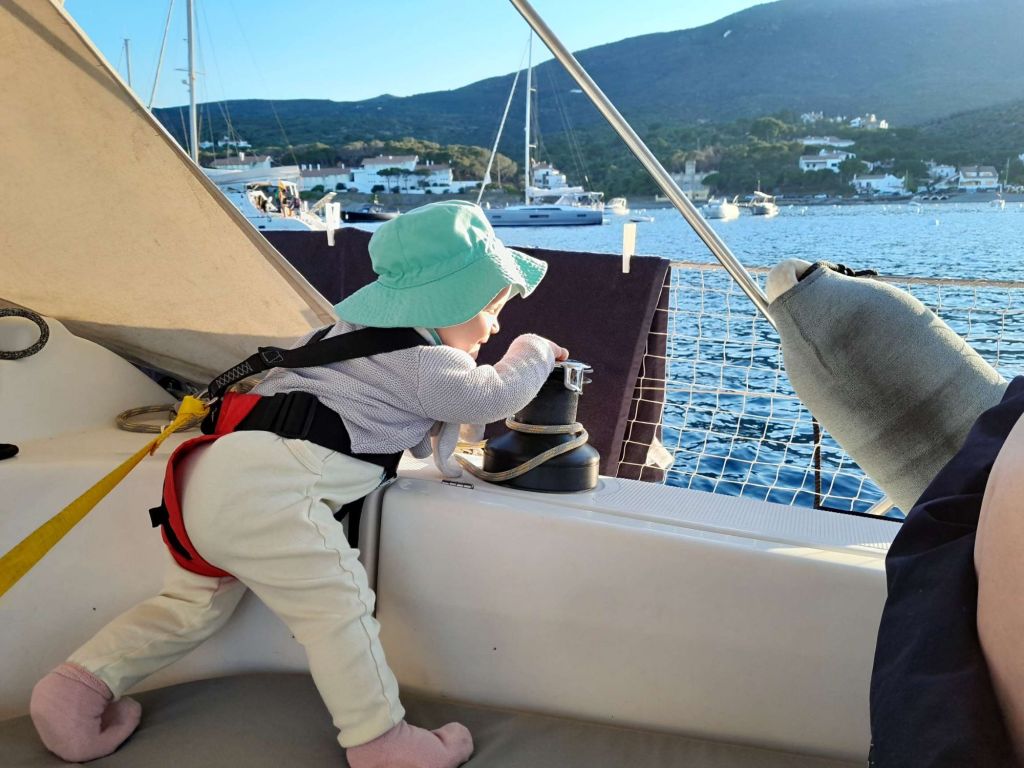 Mais très rapidement je me rends compte qu’il ne sert à rien et je le range pour envoyer le moteur. Heureusement nous n’aurons à le supporter qu’un petit quart d’heure car le vent fraichit légèrement nous permettant d’avancer à quatre nœuds à la voile. Raphaëlle quant à elle est s’intéresse de plus en plus à son environnement et veut absolument wincher !