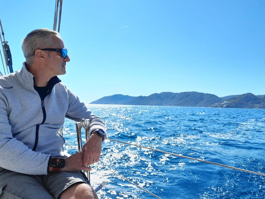 La nuit fut parfaite, sur un lac. Prendre le petit déjeuner face à la vue de Cadaques est un privilège dont je ne me lasserai jamais. Il est temps maintenant de partir direction le village de mon enfance l’Escala. Le vent est faible et j’essaye tant bien que mal à envoyer le spi asymétrique gréé sur un emmagasineur. En gros c’est comme un enrouleur mais à sens unique, tout ou rien. Pratique.