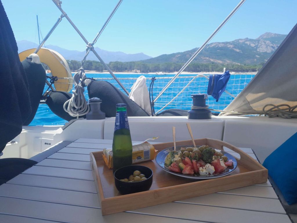 Je me réveille engourdi d’une nuit un peu agitée due certainement au veau Comtesse du Barry dégusté hier soir avec un vin Catalan. Je traîne un peu jusqu’au départ, vers 11h, dès les premières risées d’un vent d’ouest qui annonce la traversée vers la Corse sous les meilleures auspices.