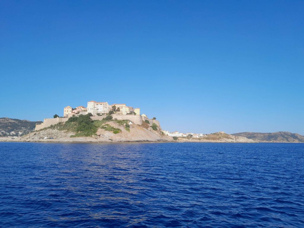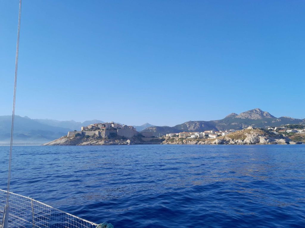 Je double le phare de Calvi 19 heures après avoir appareillé de Port Cros et ce sans avoir branché une seule minute le moteur pour faire 110 milles nautiques. Le temps de faire le tour du propriétaire de la zone de mouillage, je mouille l’ancre par huit mètre de fond. Je peux apprécier le merveilleux paysage de la baie de Calvi entre la citadelle qui a vu Nelson perdre son œil et les montagnes Corse du Monte Cintu et des névés de neige étrangement encore éternelle.