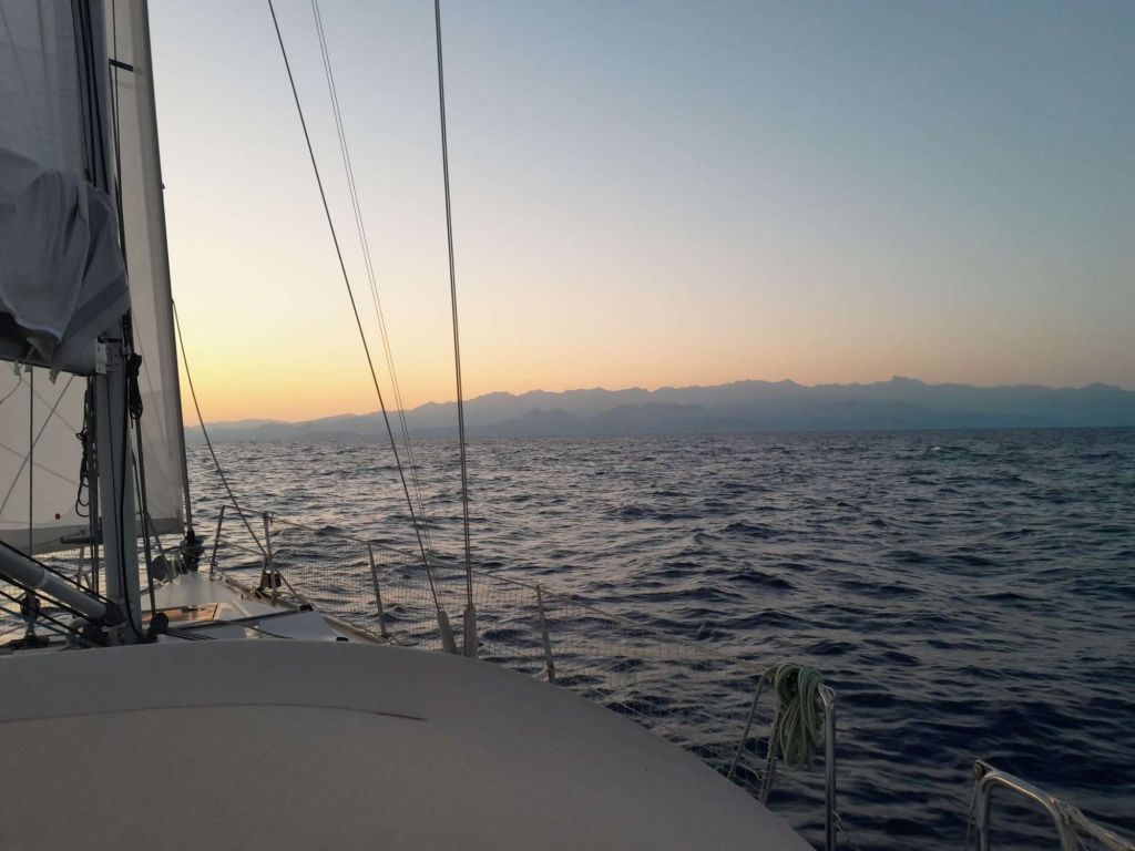 Les heures défilent et la soirée arrive rapidement. Le vent ne cesse jamais, au contraire il fraichit un peu la nuit tombée. J’enroule le Code pour passer sur génois. Nous allons à plus de six nœuds. A ce rythme nous arrivons en Corse au petit matin. Je n’ose y croire.