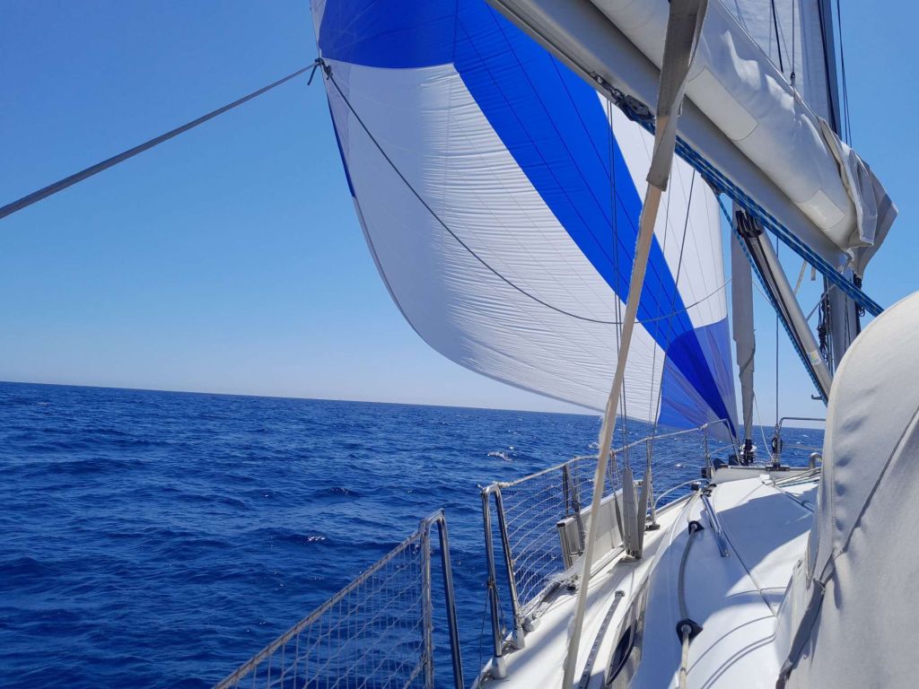 Bloqué à dix nœuds, le vent est stable et la mer magnifique. J’envoie la voile légère d’avant de beau temps, le Code 0 et propulse Babar entre cinq et plus de six nœuds.