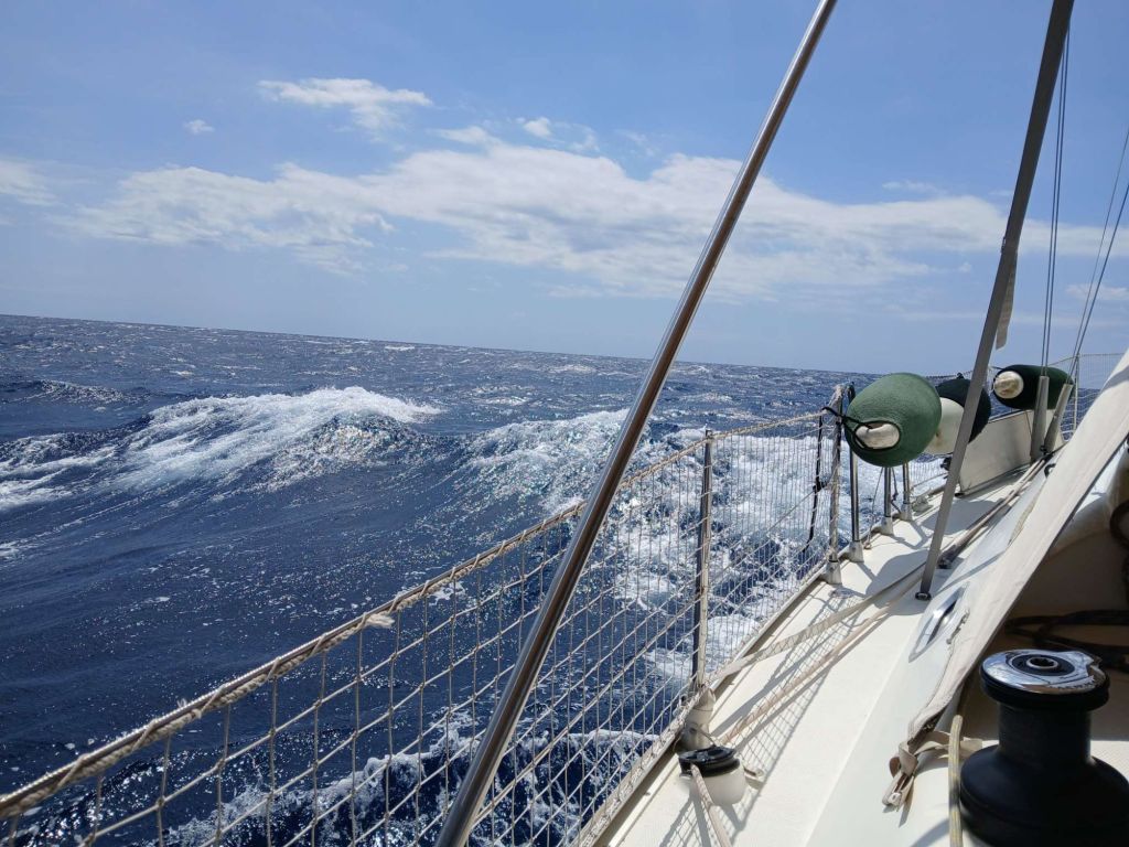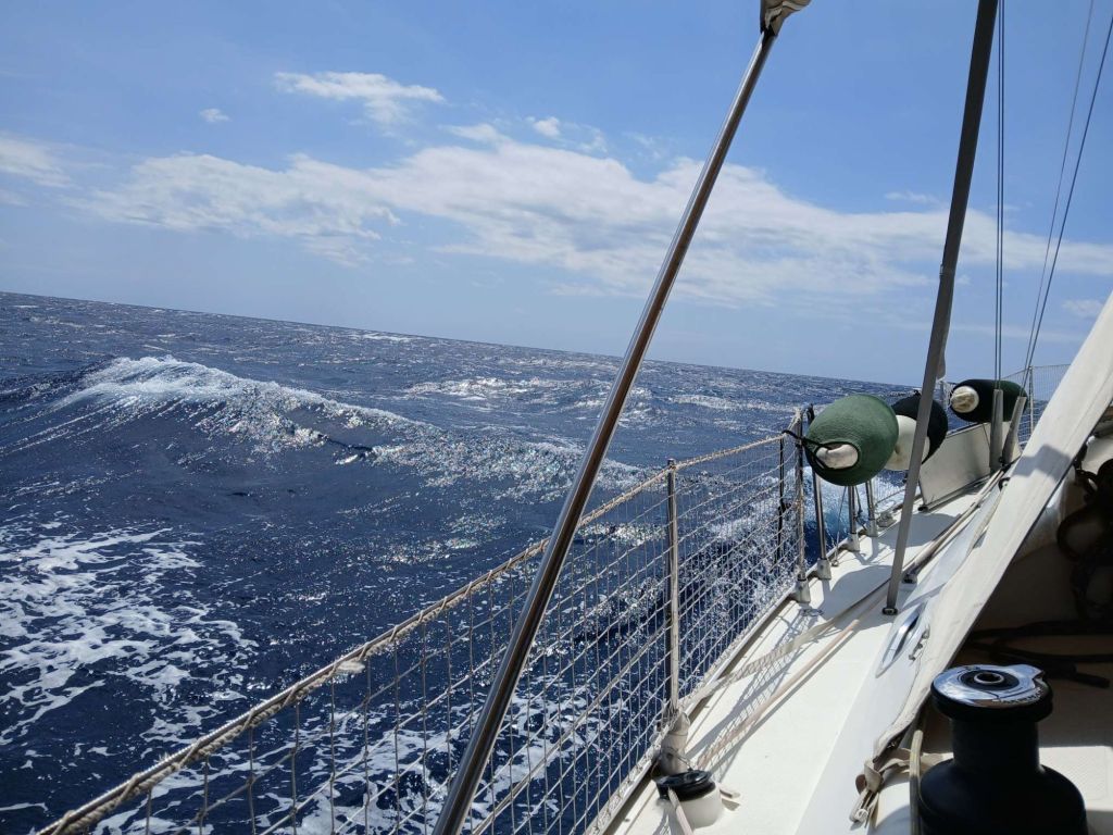 Nous allons à une belle vitesse en descendant les plus grosse vagues au surf. La mer est sublime avec différentes perceptions selon le côté où on regarde depuis le bateau. A l’arrière c’est impressionnant de voir des murs d’eau arriver, parfois deferler et porter Babar. Sur le côté face au soleil on ne dirait pas que la mer est bien formée, c’est plutôt une longe ondulation métallique. Devant c’est la guerre où l’on peut anticiper les zones de renforcement du vent, établir sa stratégie.