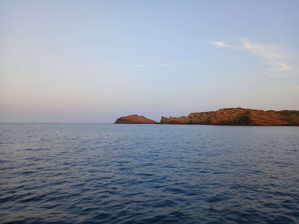 Cap maintenant vers la côte est de l’île que je ne connais pas. Je décide d’aller mouiller l’ancre dans le parc naturel de Es Grau. J’appareille à 11h sous voile. Le vent est du nord et favorable pour une navigation à la voile. Je découvre progressivement cette côte qui ressemble un peu, sous certains aspects à la côte de chez moi avec des rocailles brunes et en arrière plan, ses reliefs boisés. Je suis grand largue à plus de 5 noeuds et arrive sur zone vers 14h pour mouiller l’ancre. Je suis protégé de la houle du nord par une île et du sud par un cap. À l’ouest, une petite cité blanche, Es Grau, me fait encore penser à la Grèce. Ce pays est devenu mon maître étalon en terme de beautés marines, je l’ai désormais ancré en moi comme une référencé quasi mystique. Qui n’a jamais vécu l’arrivée à la voile sur une île grecque, mouillé l’ancre dans un de ses « ormos » à fleur de terre, et observé le Meltem décaper la mer au large, celui là n’a rien vécu.
